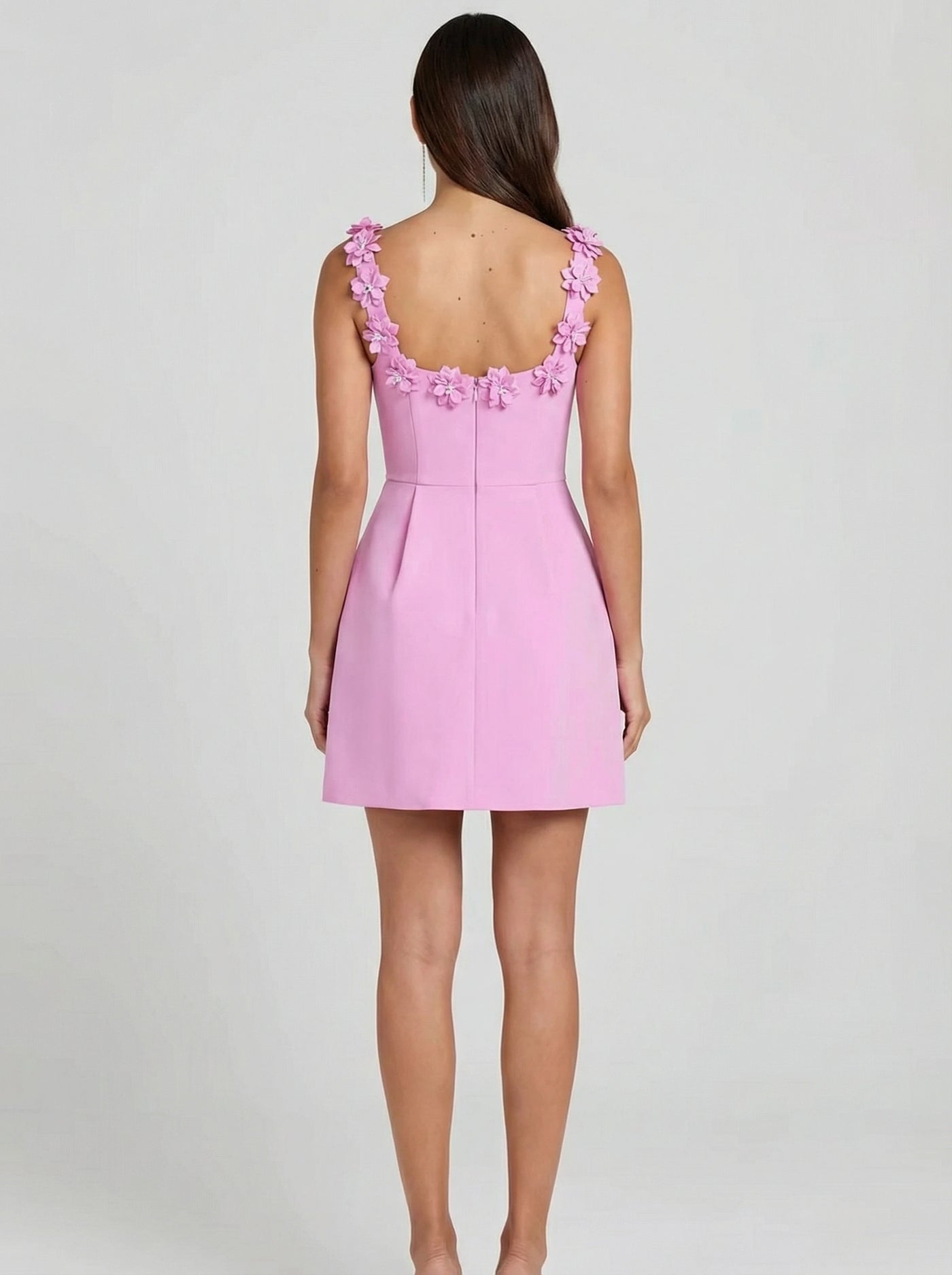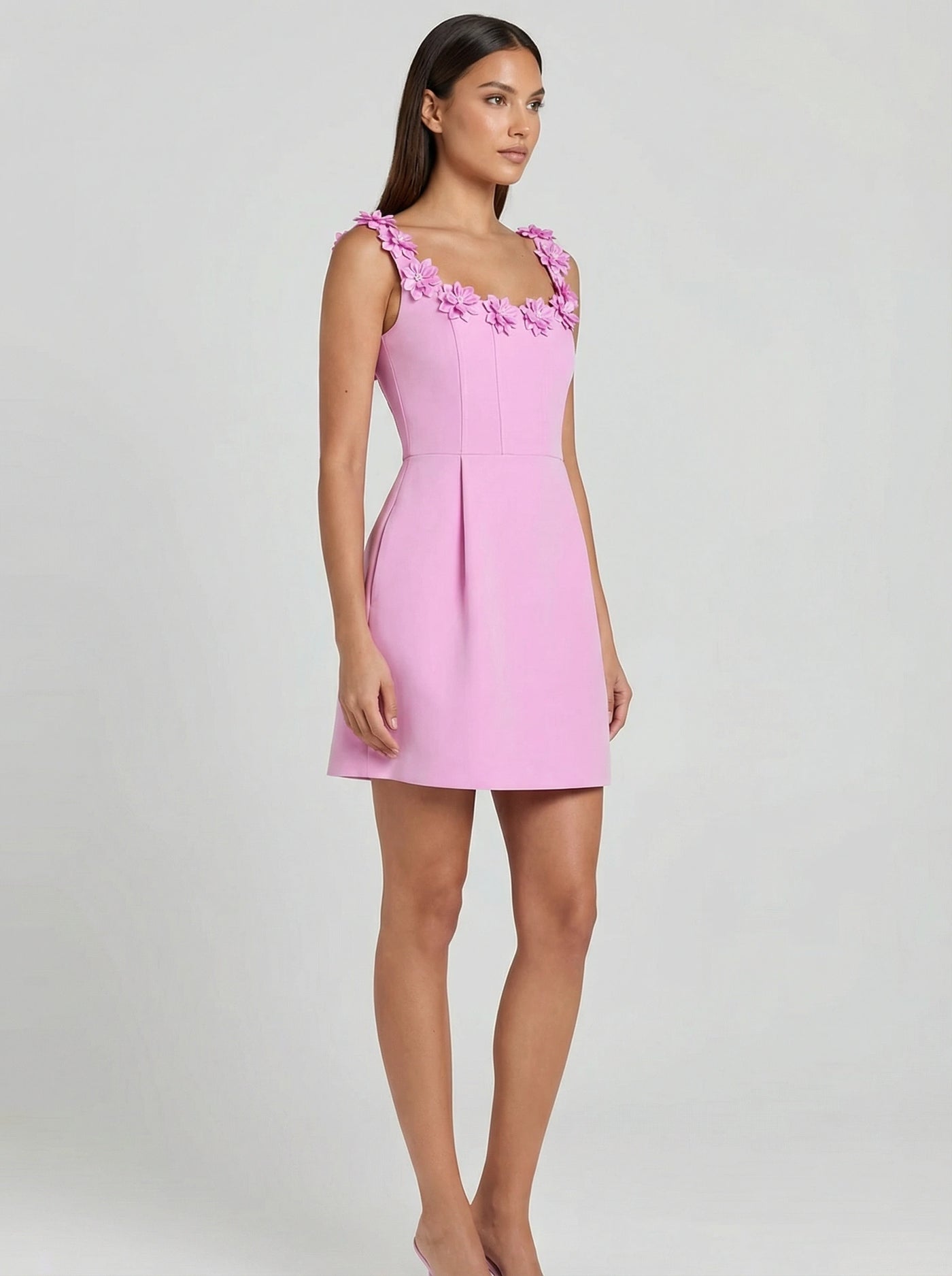 Vestido curto com decote reto e alças largas decoradas com aplicações florais. Modelagem em A com cintura marcada e caimento estruturado, mantendo leveza ao vestir. Detalhe de pregas na saia que cria volume suave e visual delicado. Ideal para eventos diurnos, festas leves e ocasiões especiais.