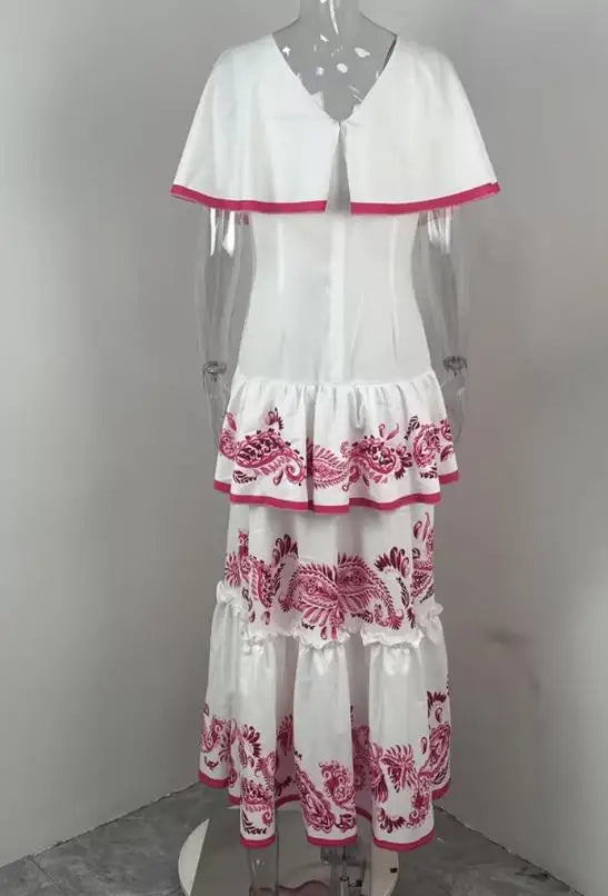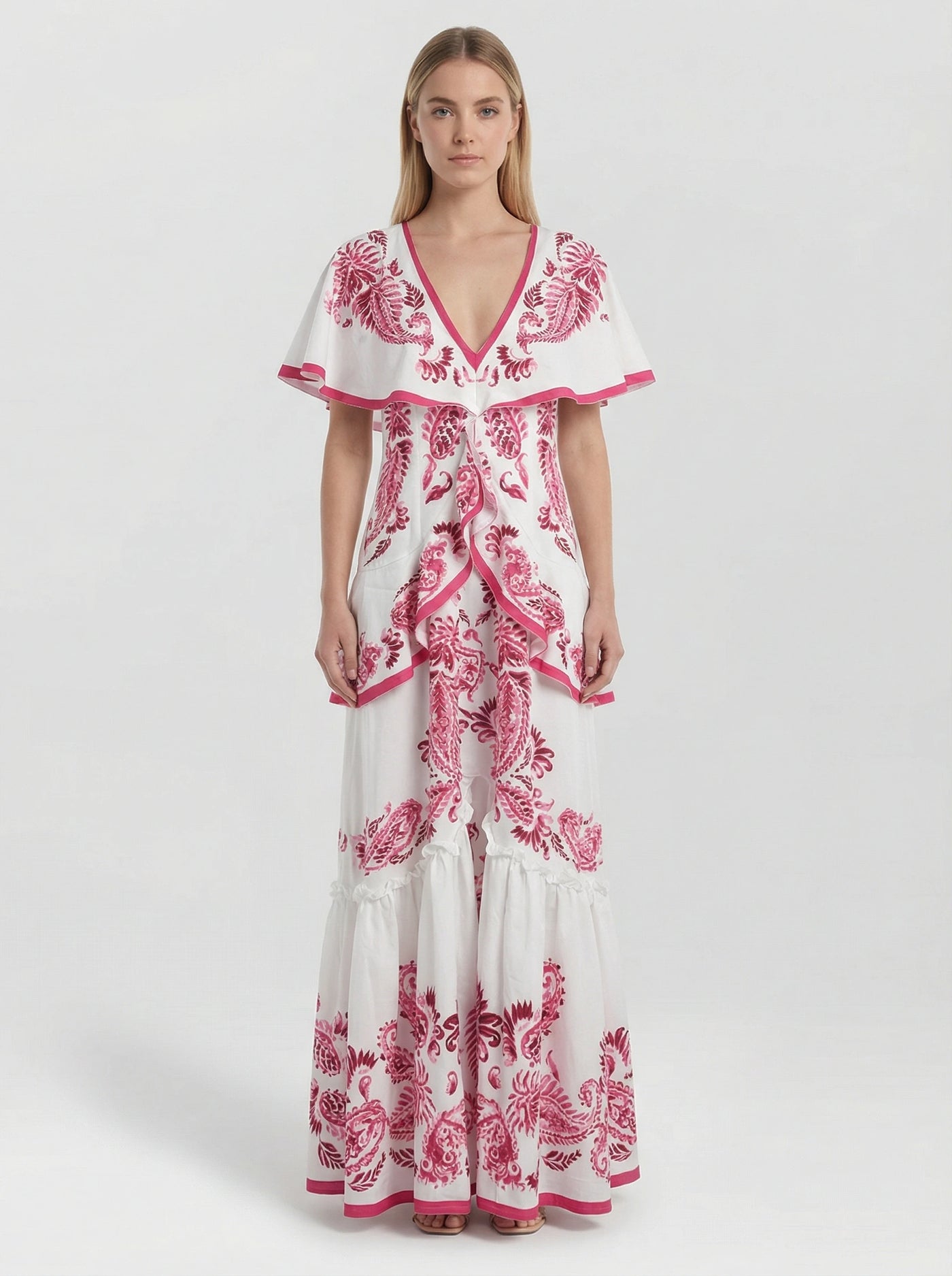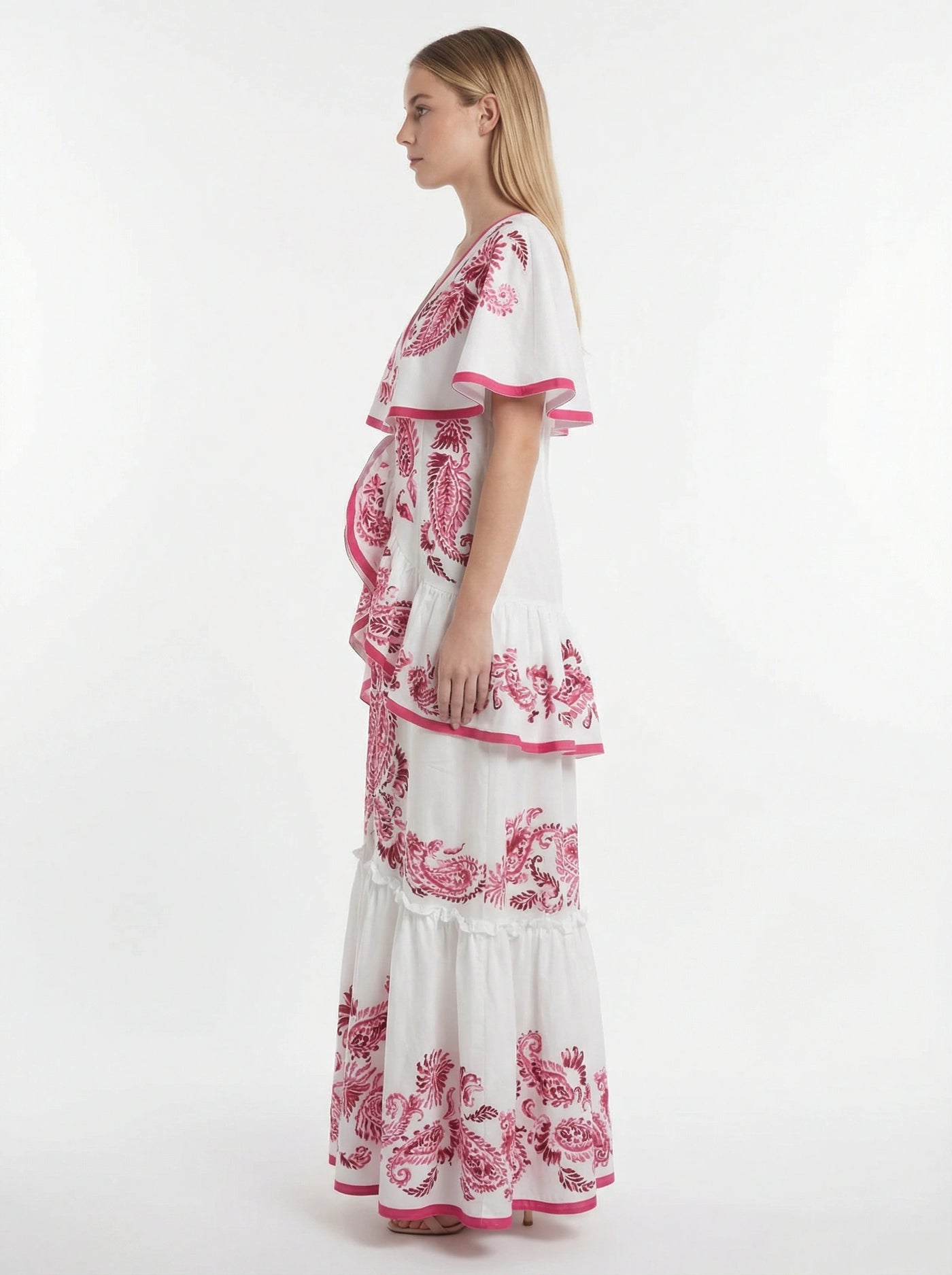 Vestido longo estampado com decote V e mangas curtas amplas. Modelagem em A com cintura marcada e caimento fluido ao longo do corpo. Detalhe de babado na barra que traz movimento e leveza. Confortável e elegante para dias quentes, viagens e ocasiões diurnas.