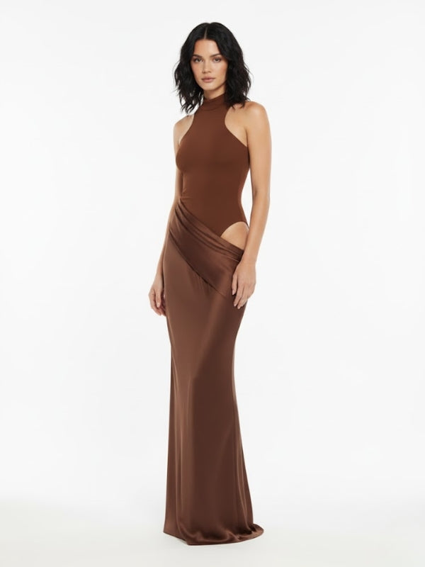 Vestido longo com gola alta e modelagem ajustada ao corpo. Design sem mangas com recortes laterais sutis e detalhe transpassado na saia, que valoriza a silhueta. Caimento fluido com leve elasticidade, oferecendo conforto e elegância ao vestir. Ideal para eventos noturnos e ocasiões especiais.