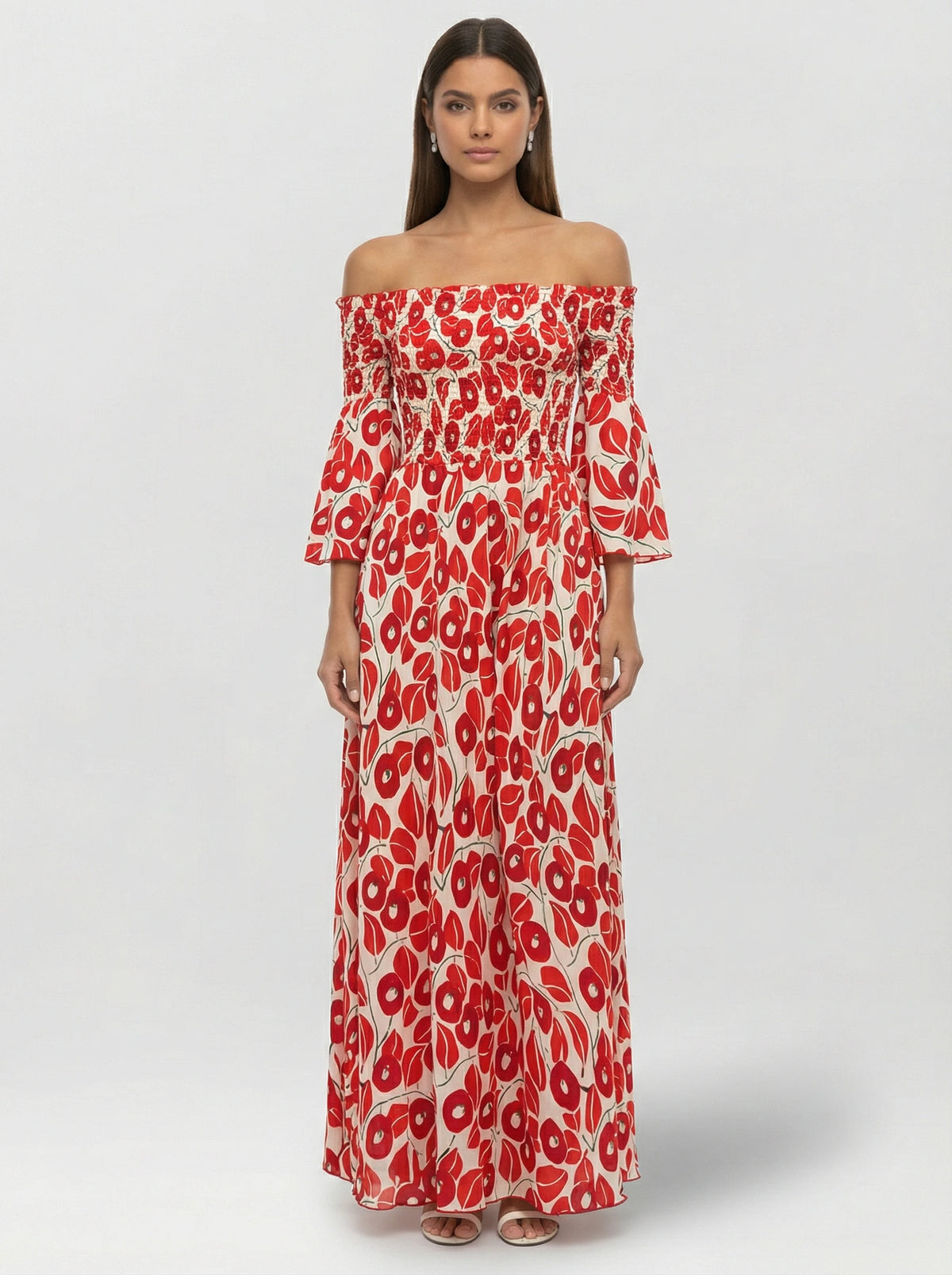 Vestido longo com decote ombro a ombro e modelagem soltinha. Caimento leve com cintura natural e saia ampla que traz movimento. Mangas 3/4 com acabamento flare e estampa floral marcante. Confortável e fácil de vestir, ideal para dias quentes, passeios e ocasiões casuais.