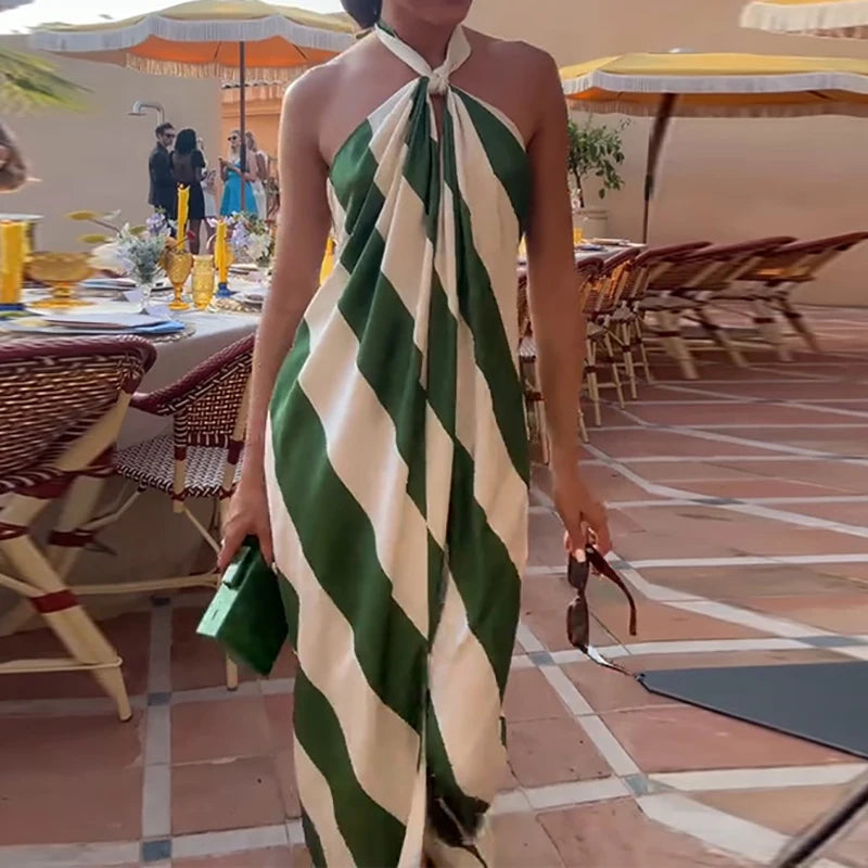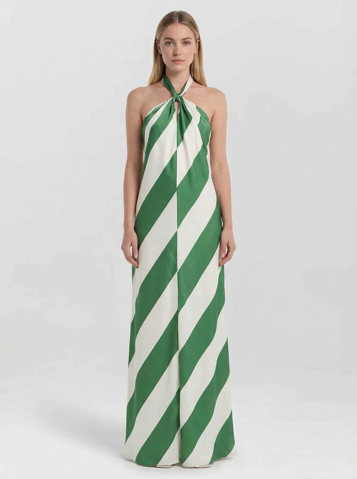 Vestido longo estampado com decote halter e amarração no pescoço. Modelagem em A com caimento solto e confortável ao longo do corpo. Detalhe vazado frontal que valoriza o colo com leveza. Ideal para dias quentes, viagens e produções de verão.